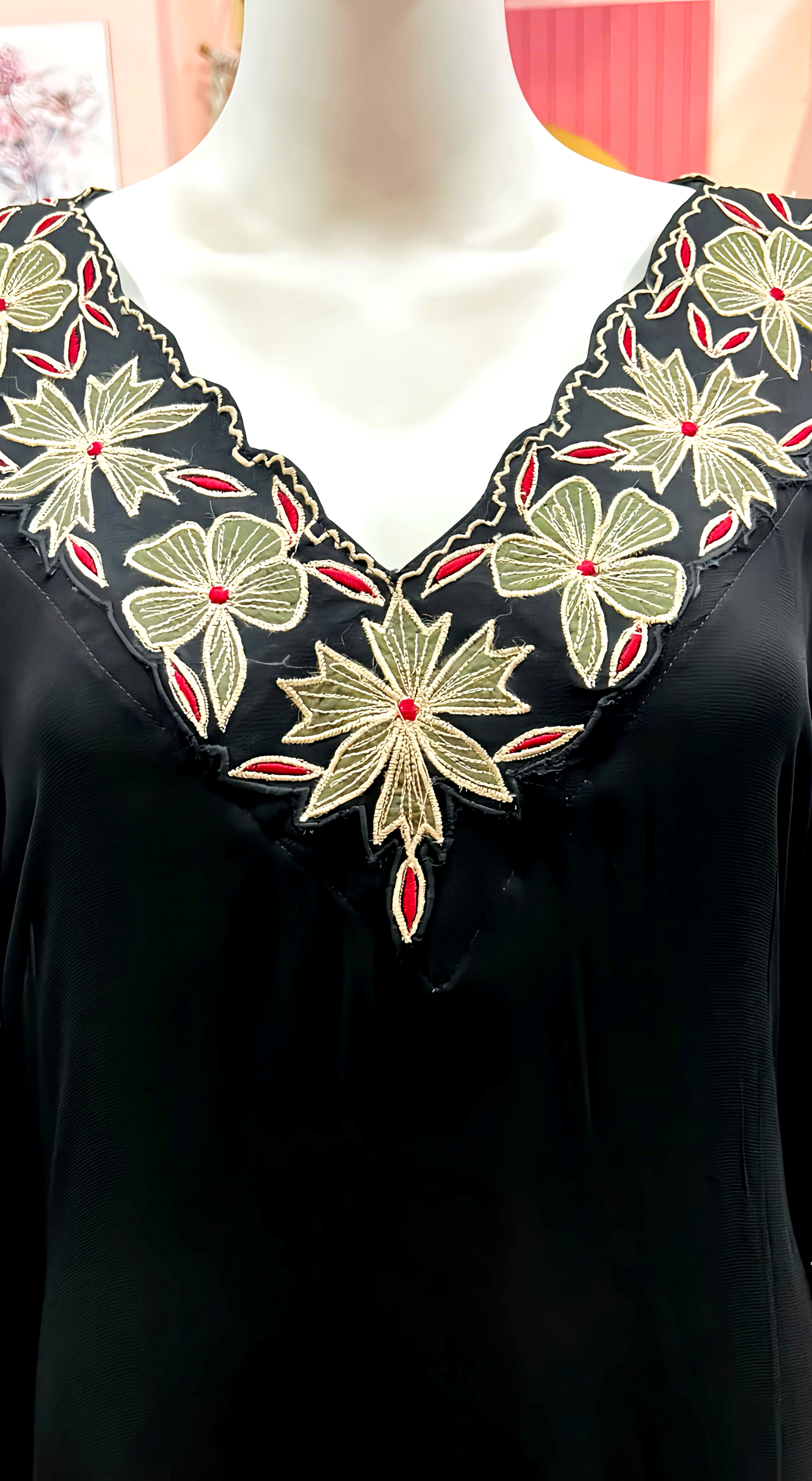 Elegant black designer kaftan adorned with exquisite embroidery work that adds a touch of sophistication and glamour to this versatile piece, complete with a matching inner for added comfort and modesty. This beautiful kaftan combines effortless style with intricate detailing, featuring a flowing silhouette that flatters all body types, making it perfect for festive occasions, evening gatherings, or as a statement piece for special celebrations.