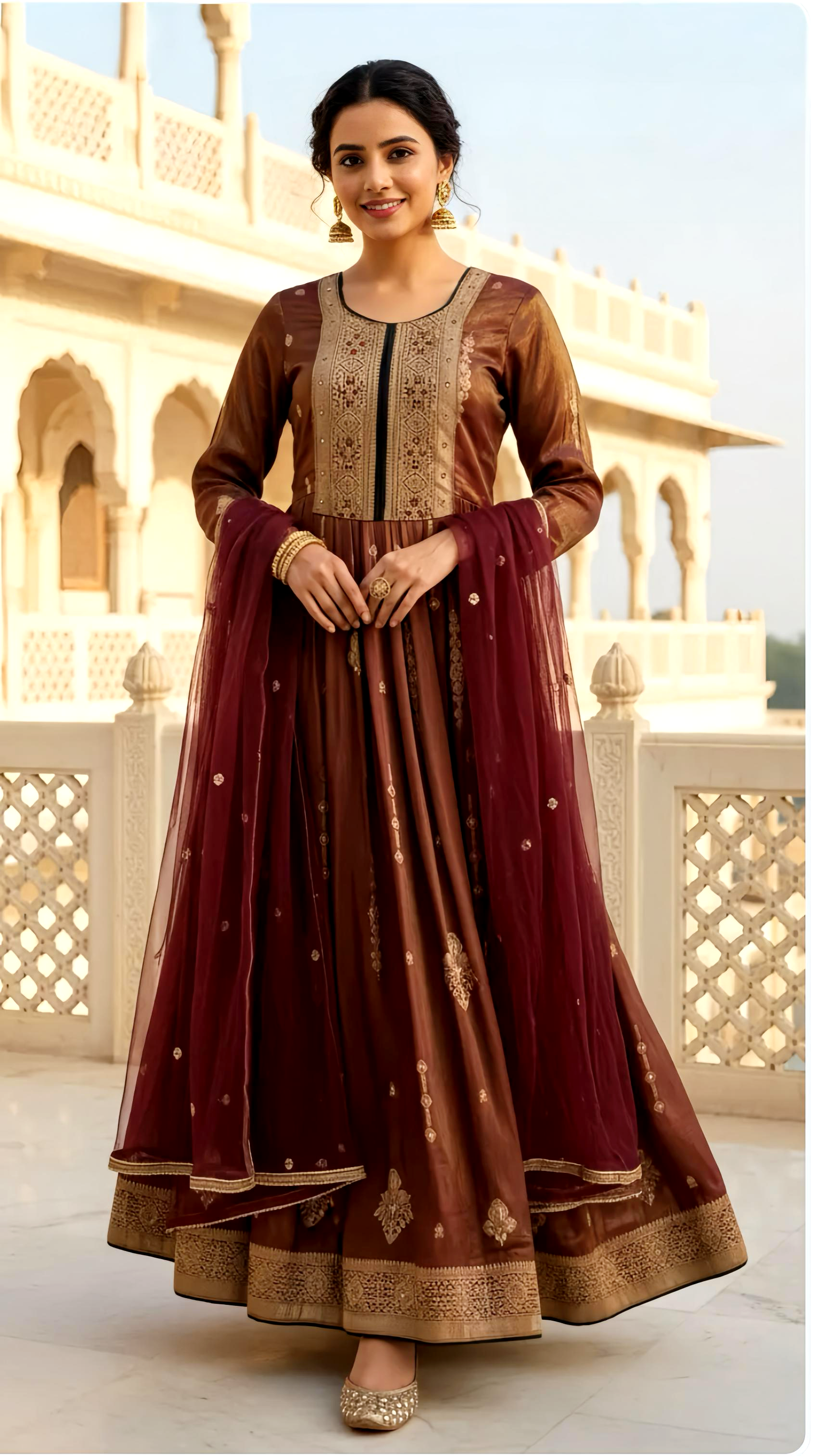 Grace meets elegance in this stunning gown crafted from ultra-soft liquid organza, offering a luxurious drape and ethereal flow. The exquisite dual-tone brown hue flatters every skin tone, radiating warmth and sophistication. Paired with a delicate net dupatta adorned with subtle detailing and embroidery at yoke this ensemble is perfect for festive occasions, evening soirées, or intimate celebrations. A timeless piece that blends modern charm with classic grace.