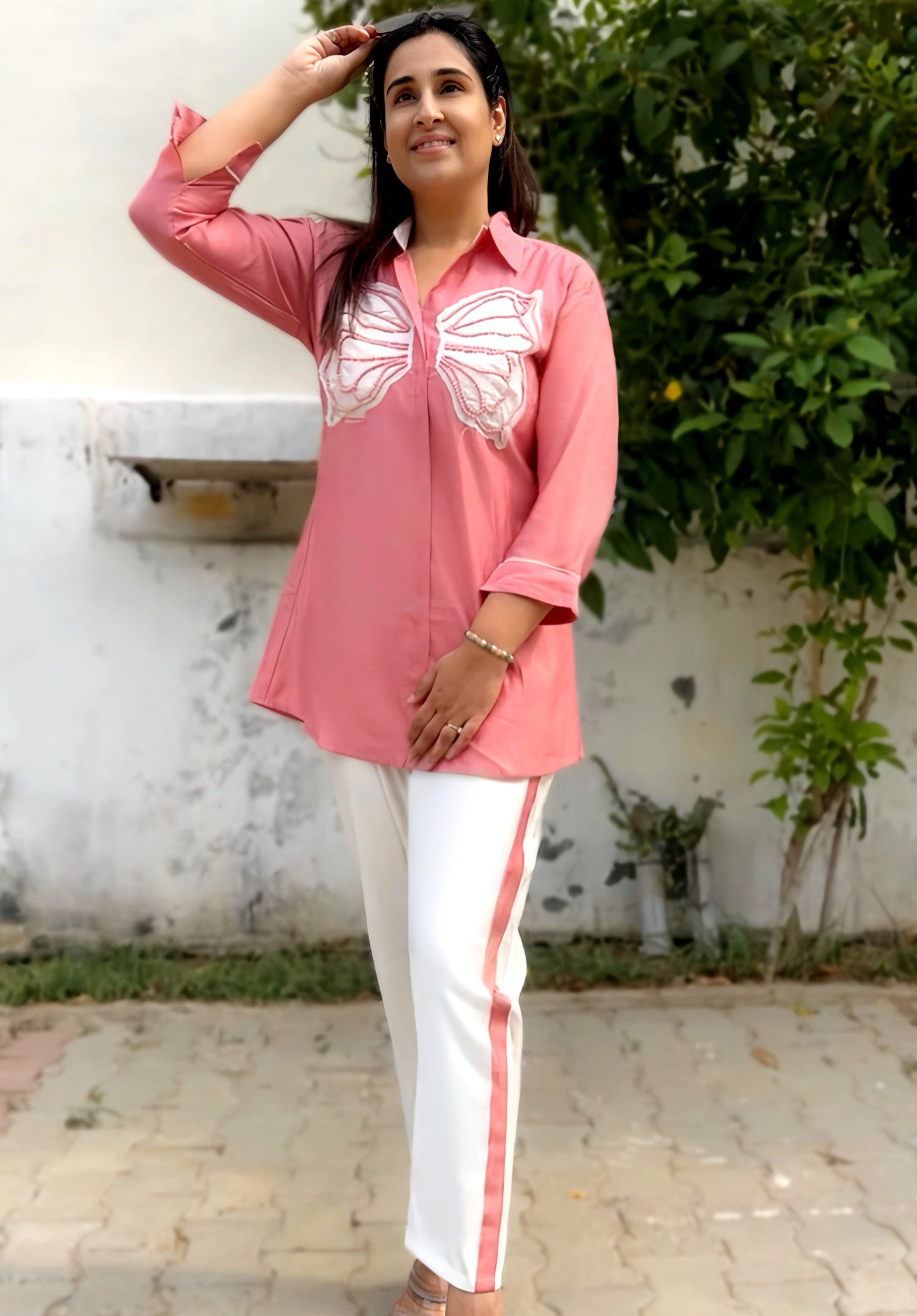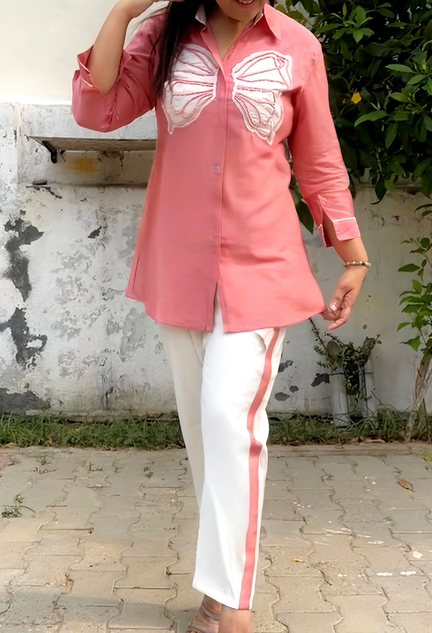 Presenting you modern western coord set in canvas cotton and with applique hand embroidery. Cotton is with shine for luxe look . You can use its shirt with another pants for second causal look .