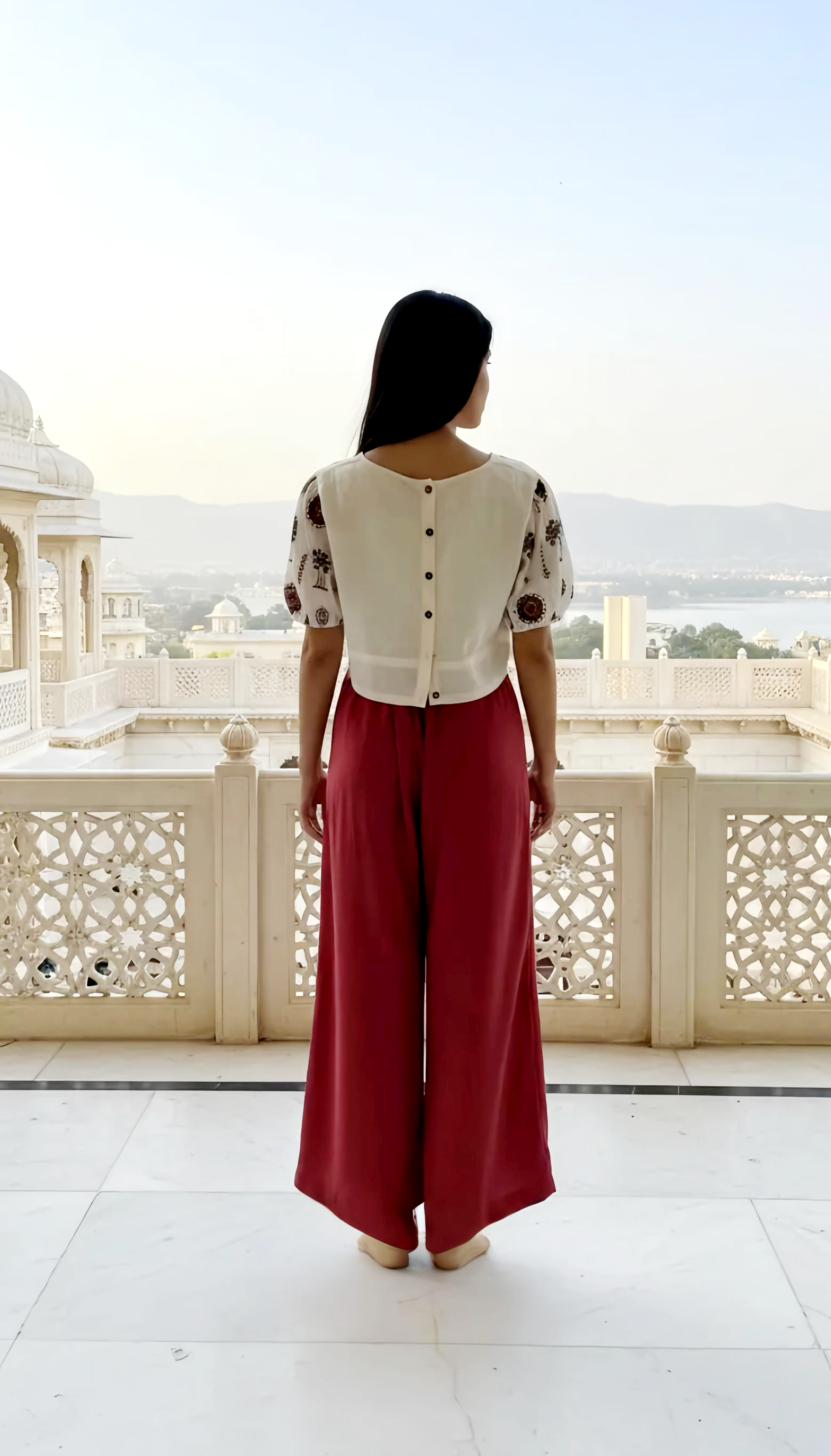 Make a bold statement with this stunning crop top adorned with exquisite hand embroidery detailing, perfectly paired with trendy bell bottom pants. The ensemble features a cute bow on the waist, adding a charming touch to this chic and contemporary outfit.
