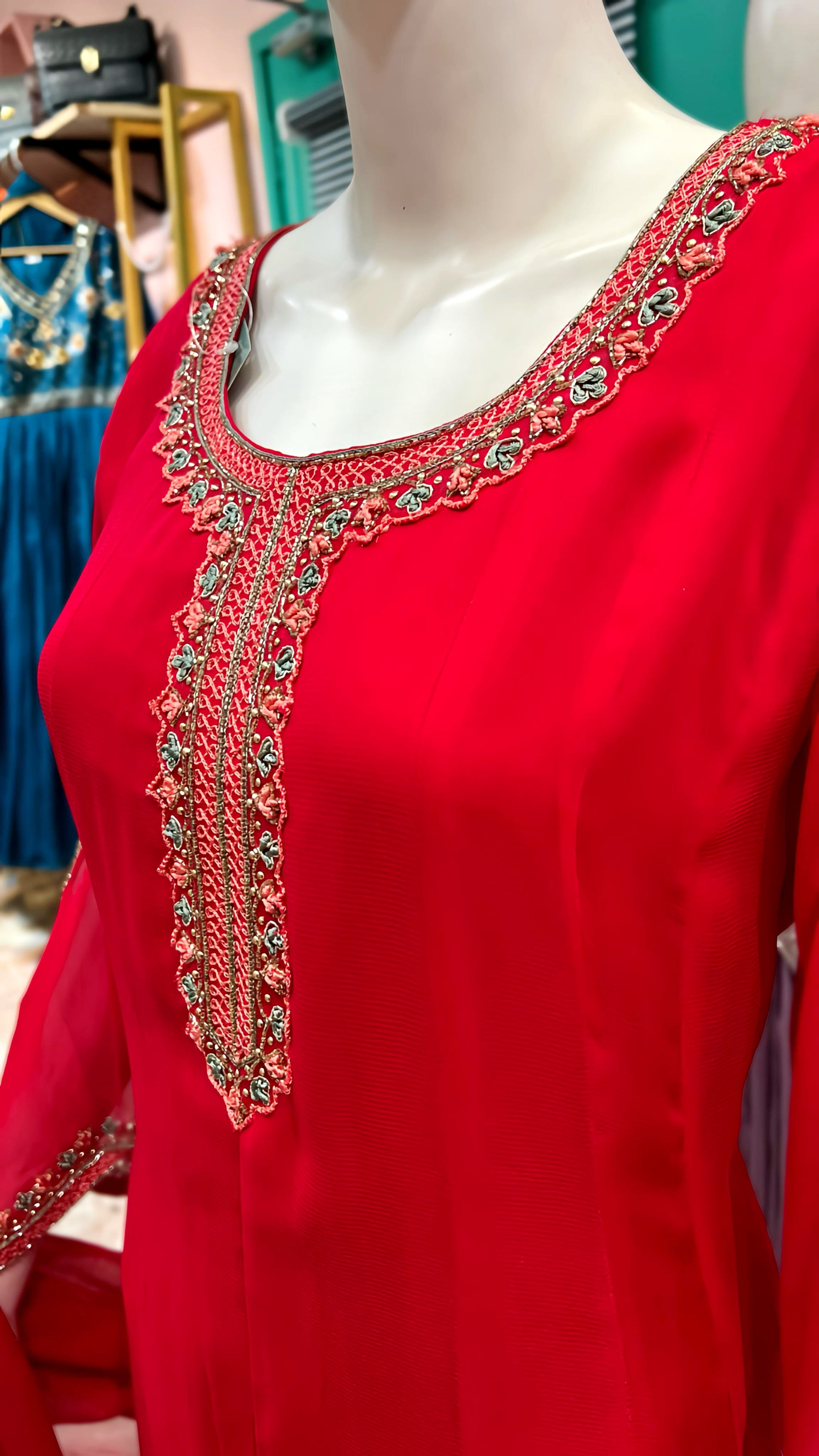 Graceful georgette Anarkali featuring stunning heavy embroidery on the sleeves that adds a touch of opulence and artistry, paired with a smart dupatta and tailored pants for a complete sophisticated look. This elegant ensemble combines the flowing beauty of georgette fabric with intricate embellishment work, creating a perfect balance of traditional charm and contemporary styling ideal for weddings, festive occasions, and special celebrations.
