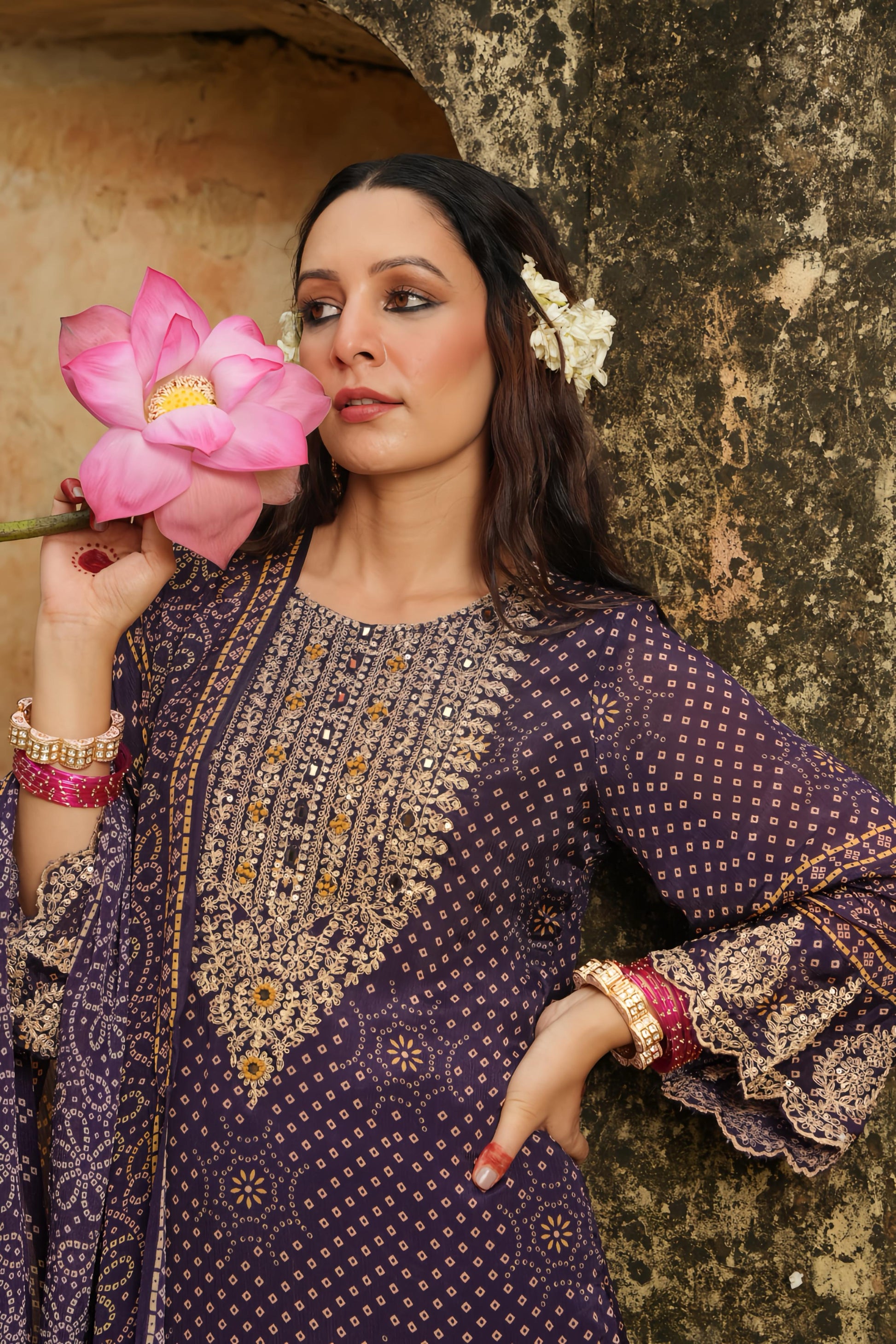 ✨ Elevate your festive wardrobe with this Pure Luxury Chinon Suit, adorned in timeless Bandhani print and enriched with intricate Zari embroidery. The soft, flowy Chinon fabric offers unmatched grace, while the traditional detailing adds a regal touch. Perfect for weddings, poojas, and all celebratory occasions, this ensemble blends heritage with elegance for a truly stunning look.