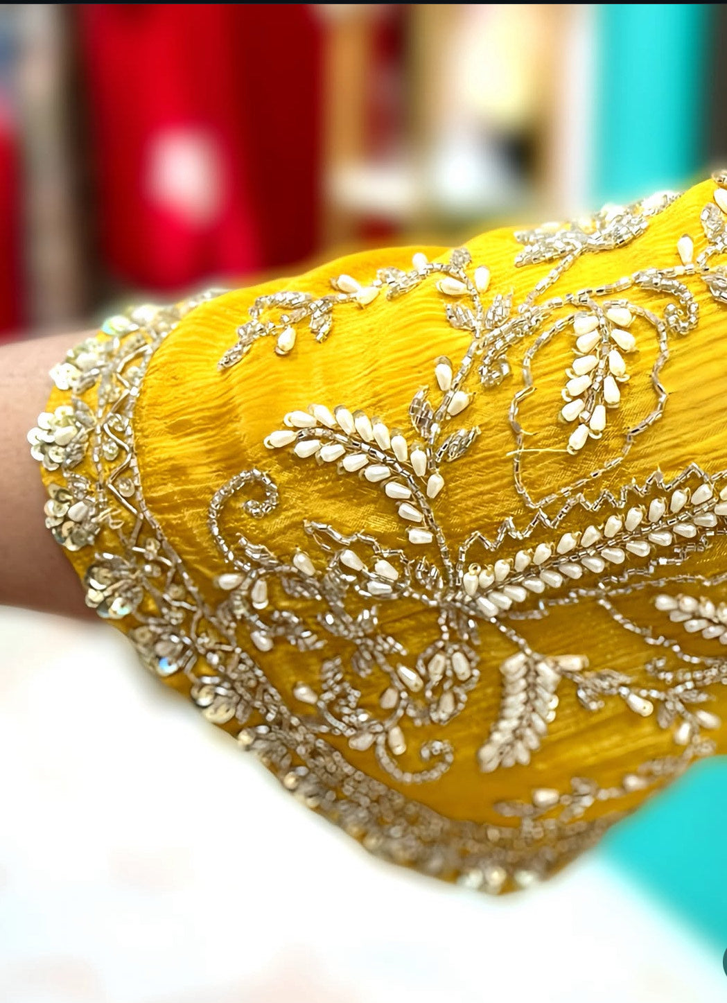 Step into royalty with this magnificent grand gown adorned with intricate hand embroidery and delicate pearl work that radiates elegance and sophistication. This breathtaking ensemble comes with a luxurious Maharani dupatta featuring heavy latkan lace detailing that adds a regal finishing touch. Every stitch tells a story of exceptional craftsmanship, making this gown perfect for weddings, grand celebrations, and special occasions where you want to look nothing short of spectacular. Experience the perfect blend of traditional artistry and contemporary glamour.