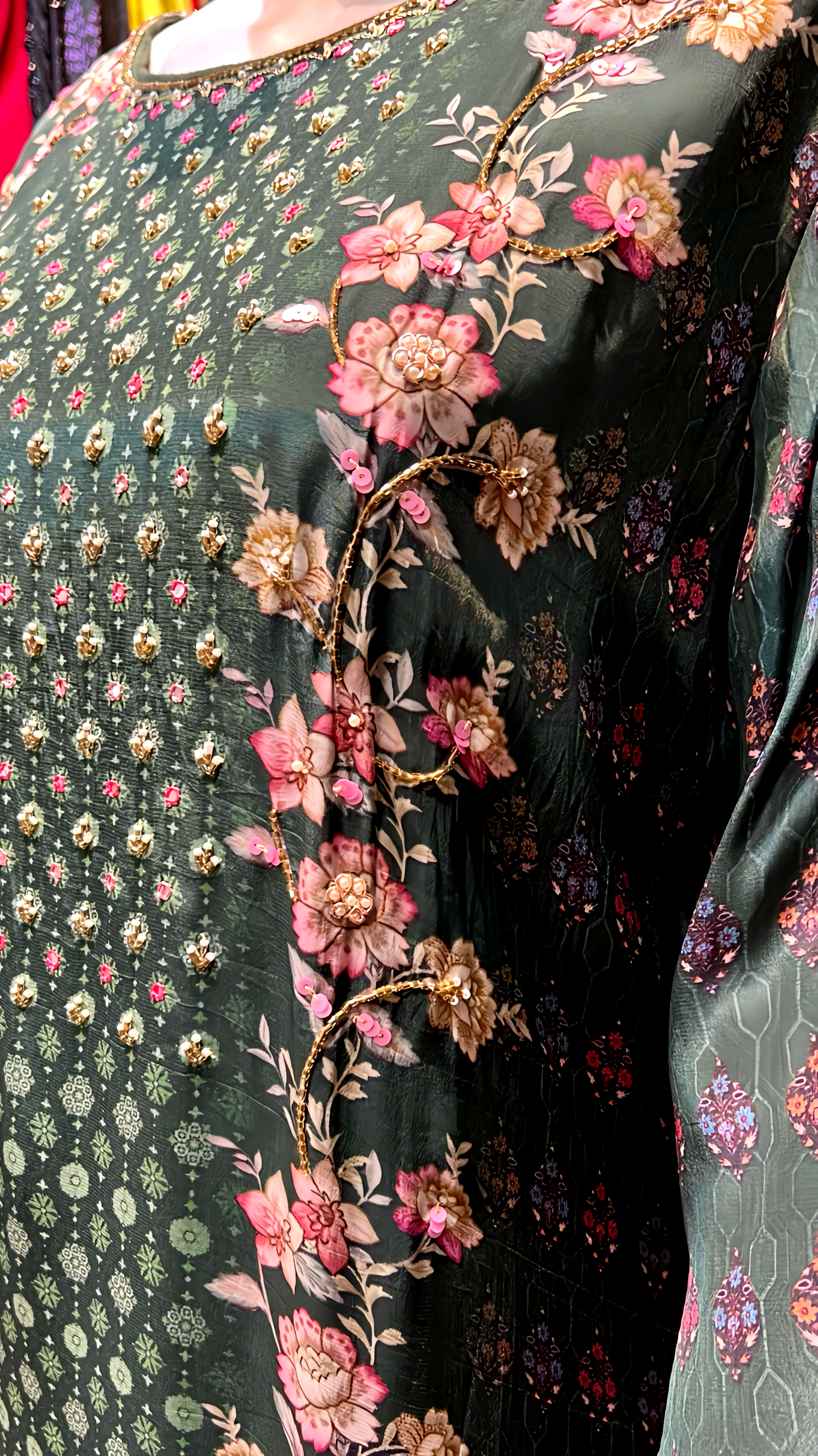 Experience the artistry of traditional craftsmanship with this stunning Indian suit, meticulously adorned with intricate hand embroidery detailing. Each stitch reflects hours of skilled workmanship, creating a masterpiece that combines cultural heritage with contemporary elegance for your special moments.