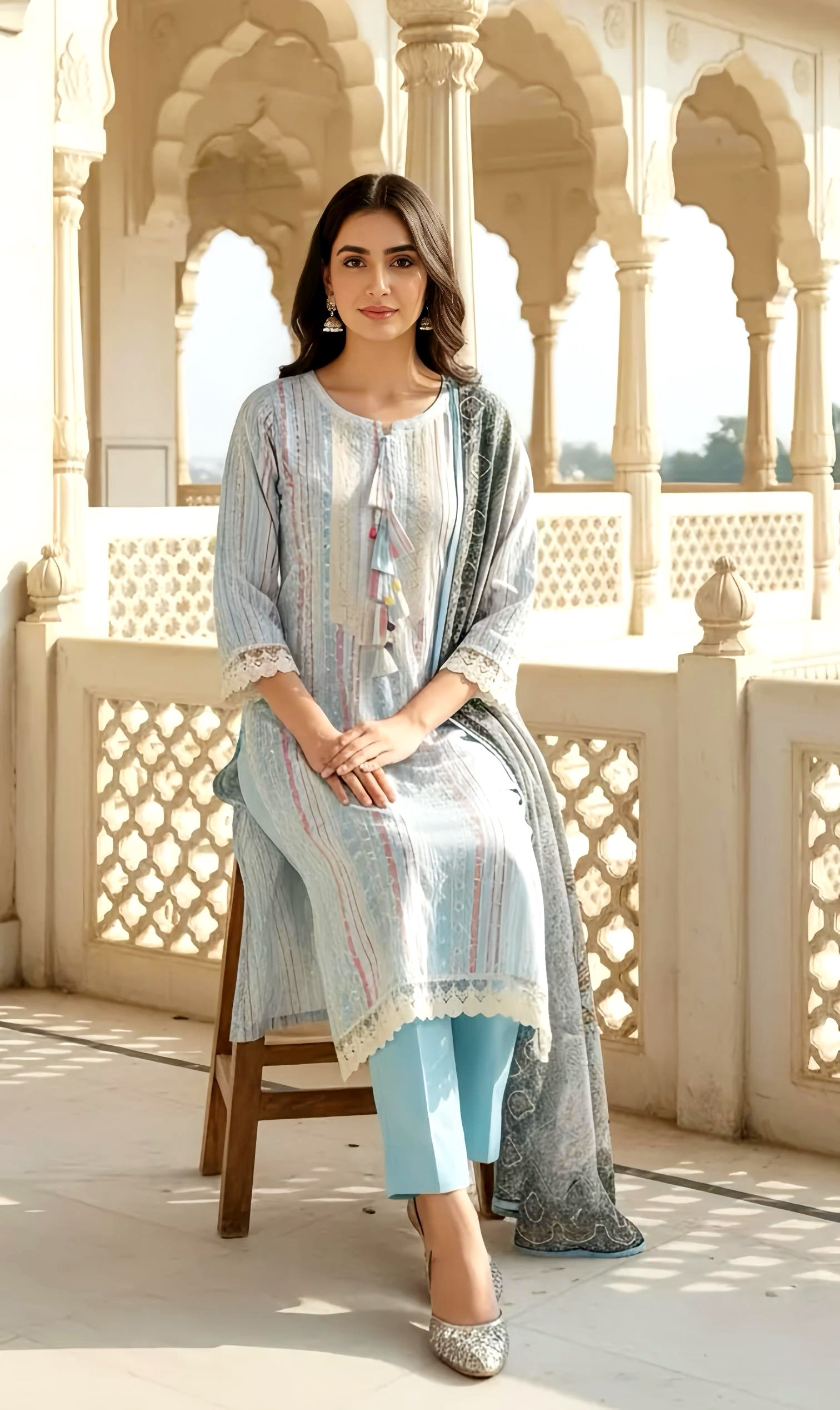 Elevate your ethnic wardrobe with this exquisite cotton suit featuring premium lining for ultimate comfort and durability. The neckline is adorned with beautiful handmade latkans that add a touch of traditional elegance, perfectly complemented by smart, well-tailored pants. Complete your look with the designer dupatta that brings together sophistication and style in one stunning ensemble.