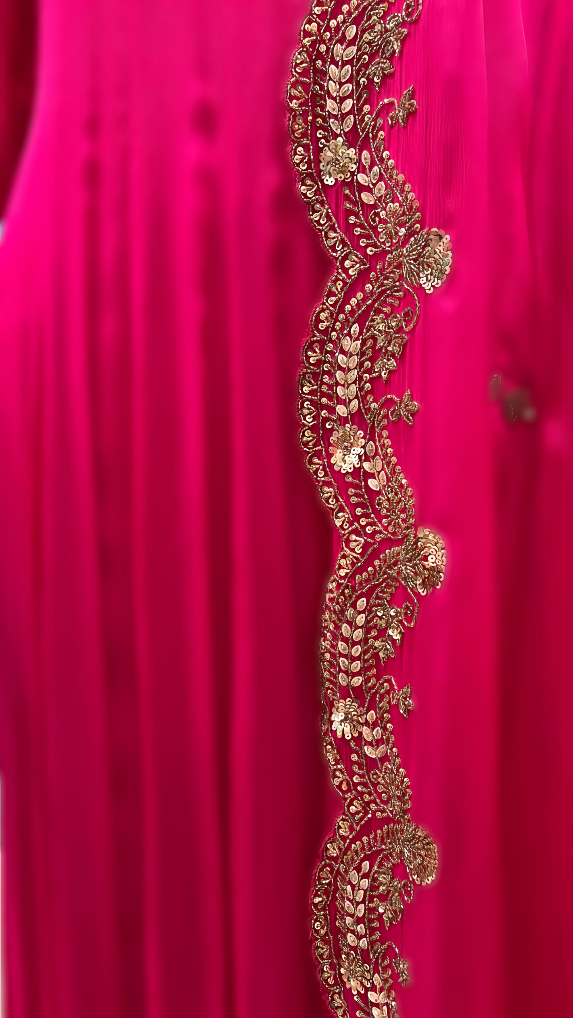 Make a stunning statement with this exquisite designer gown in beautiful rani pink, adorned with heavy embroidery on the neck, arms, and sleeves that showcases exceptional artistry. Paired with a luxurious heavy dupatta, this designer piece is perfect for weddings, receptions, and grand celebrations where you want to shine.