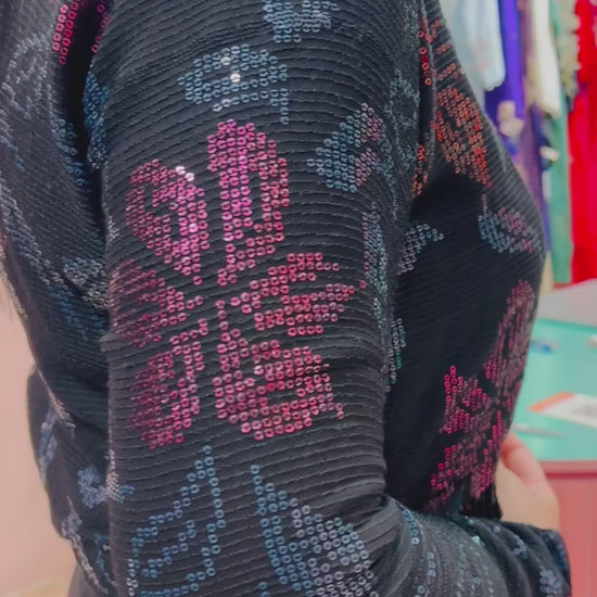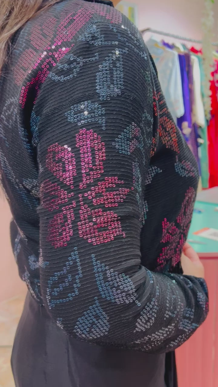Turn heads in this stunning black three-piece dress featuring dazzling sequence work on the blouse and jacket that creates a mesmerizing shimmer, perfectly complemented by an elegant drape skirt for a sophisticated silhouette. The outfit is beautifully finished with handmade tassels that add a playful yet refined touch, making this ensemble ideal for cocktail parties, evening events, and special celebrations where you want to make a bold fashion statement.