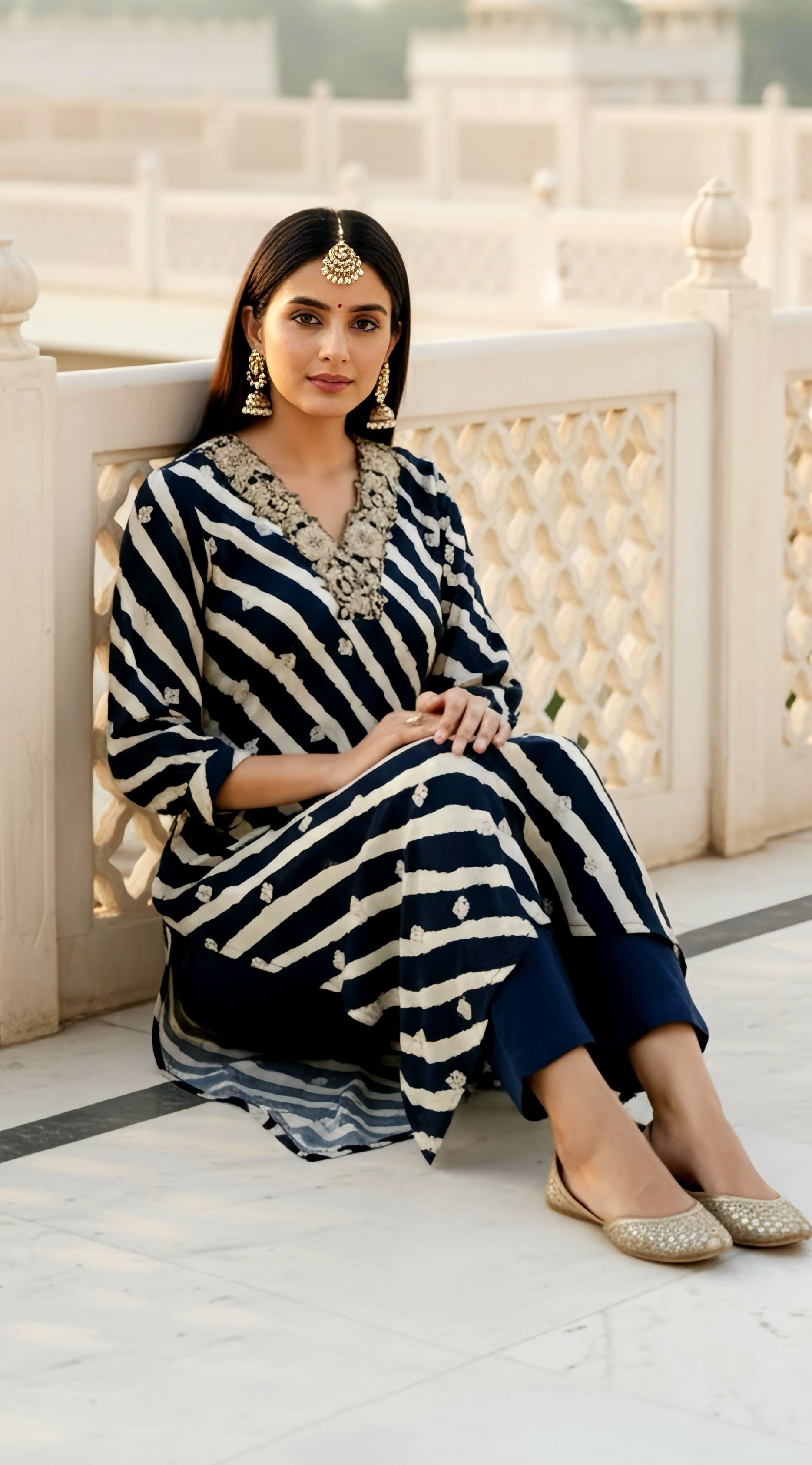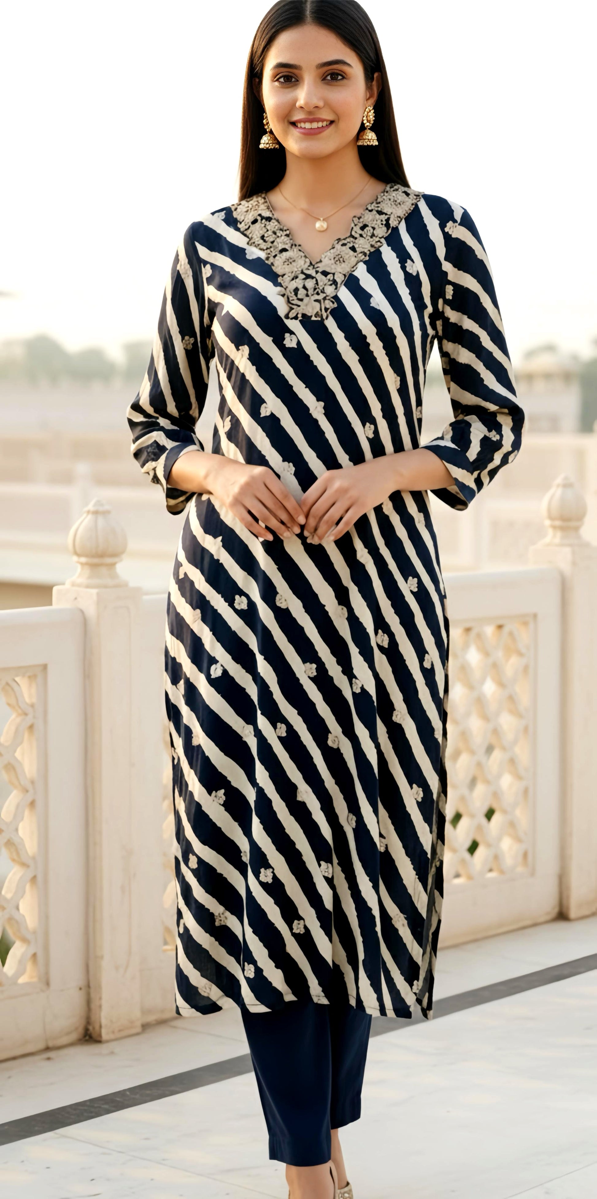 Step back in time with this retro-inspired kurta pants set crafted in luxurious muslin silk that drapes beautifully and feels incredibly soft against your skin. The unique leather embroidery at the neck adds a bold, vintage touch that perfectly captures the nostalgic charm of bygone eras with a contemporary twist. Paired with solid color pants for a clean, sophisticated look, this ensemble is ideal for those who love to blend classic aesthetics with modern comfort.