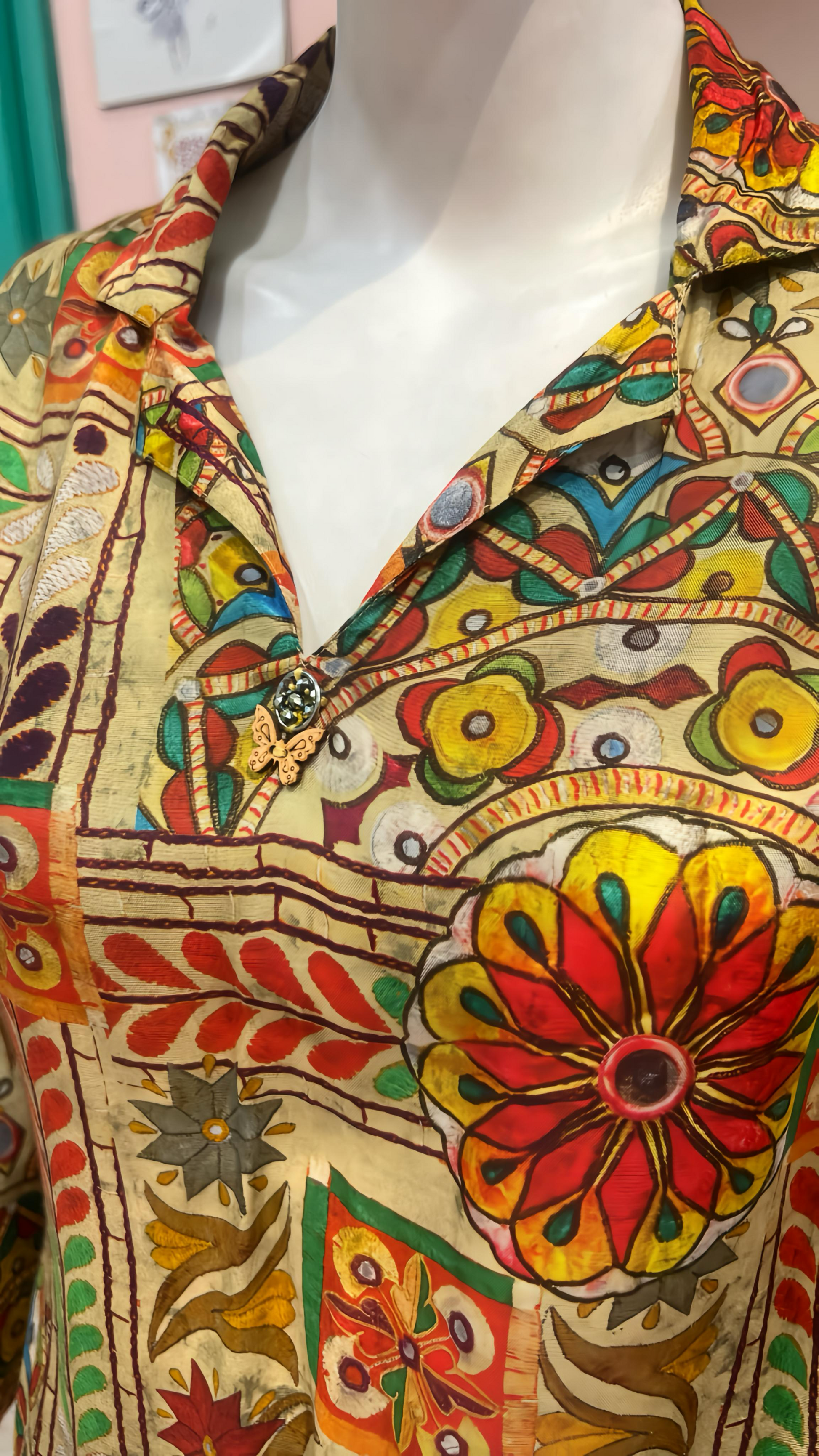 This charming ensemble pairs elegant tulip pants with a stylish C cut shirt, featuring a cute butterfly button detail at the neck and adorned with beautiful prints that add a playful yet sophisticated touch.