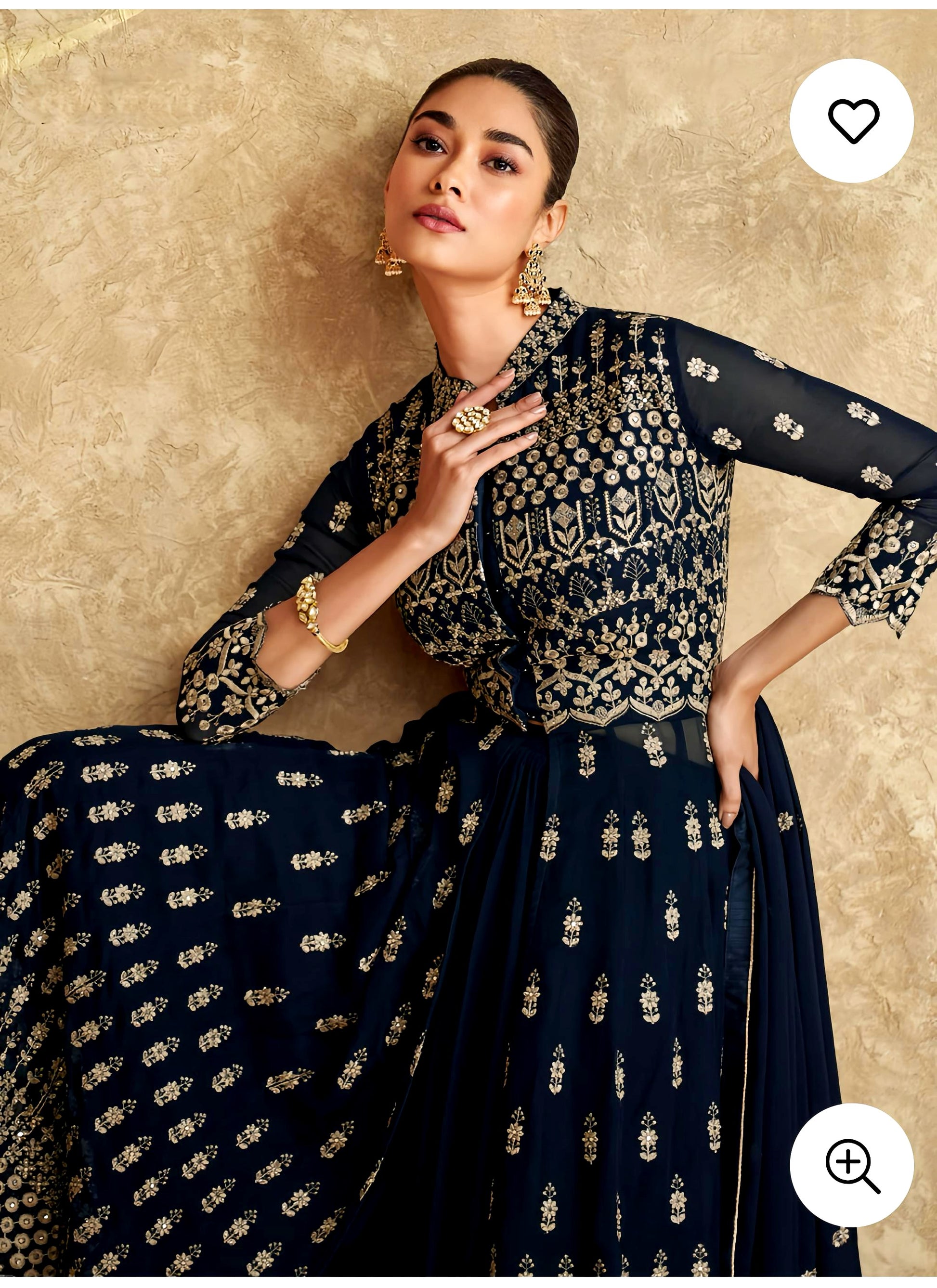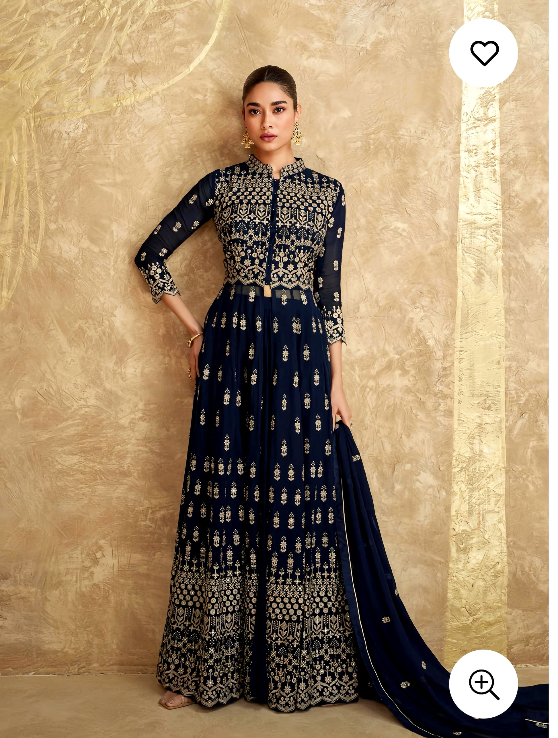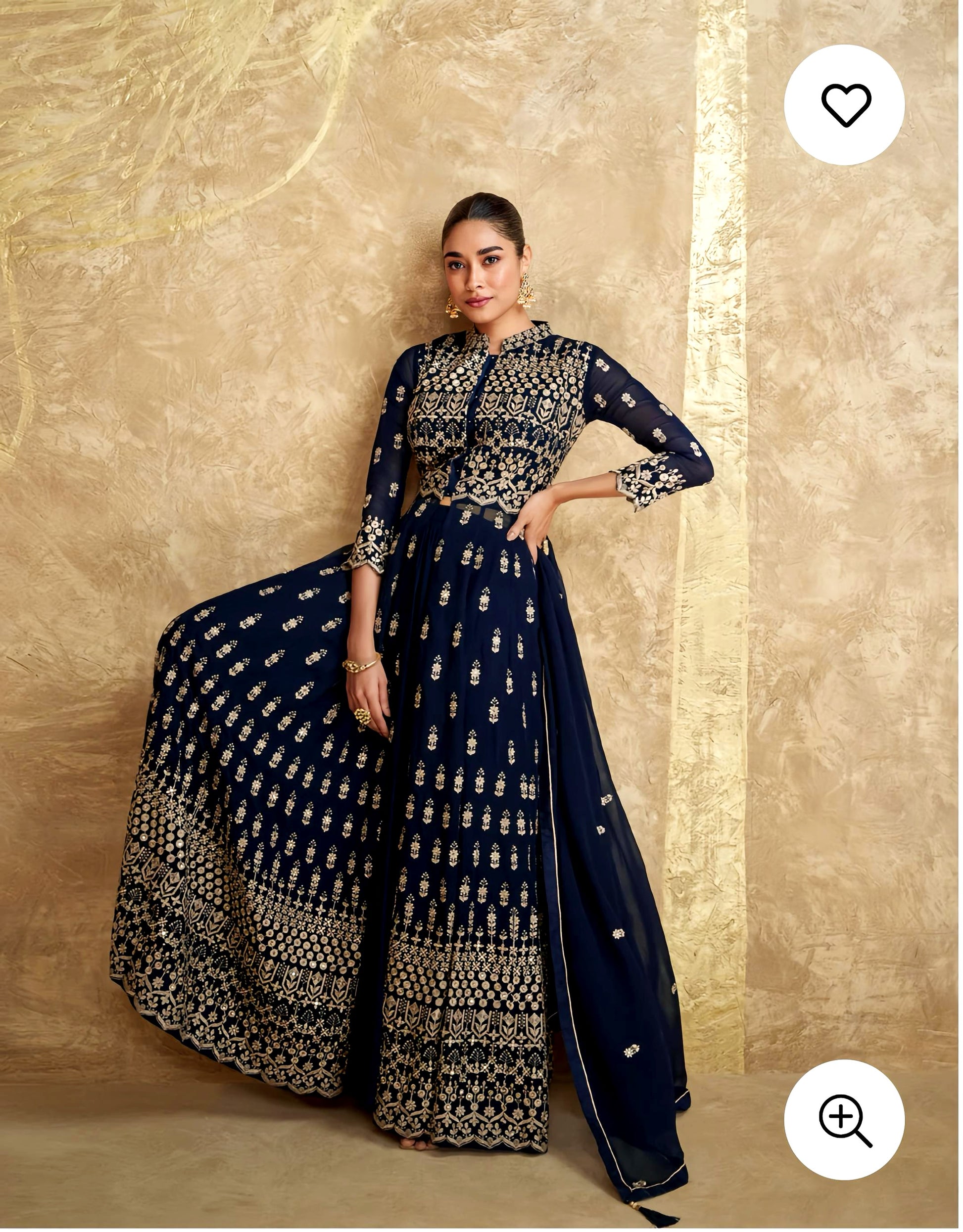 Elevate your festive style with this elegant partywear ensemble featuring a skirt-style flowy palazzo crafted in soft, pure georgette. Paired with a matching dupatta, the outfit is adorned with delicate water gold embroidery that adds a touch of regal charm. Designed in a rich, royal hue, it’s a budget-friendly beauty that blends grace with glamour.