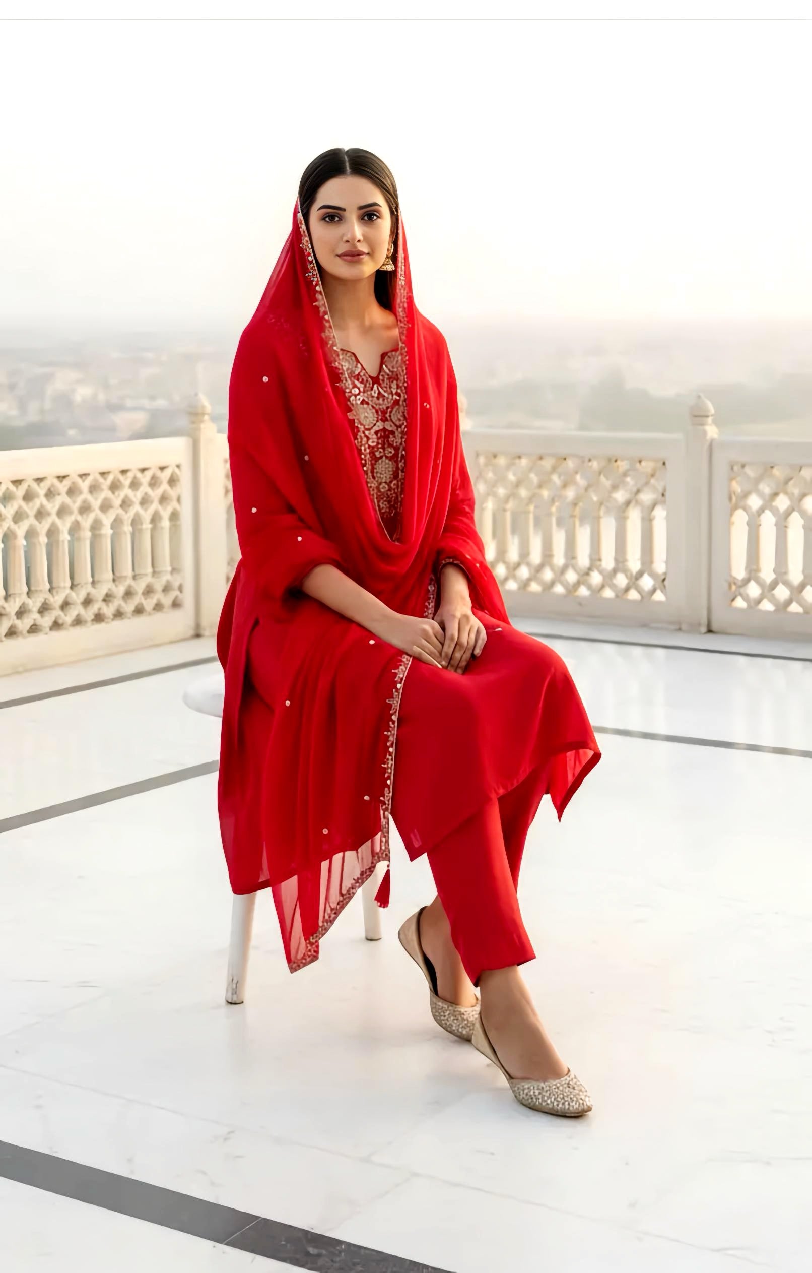 Embrace timeless elegance with this stunning red traditional suit, featuring exquisite hand embroidery on the neck and dupatta that showcases intricate craftsmanship and artisanal excellence. The classic red hue symbolizes celebration and joy, making this ensemble perfect for festive occasions, weddings, and cultural gatherings. Paired with sleek straight pants for a refined, contemporary silhouette, this outfit beautifully balances traditional charm with modern sophistication.