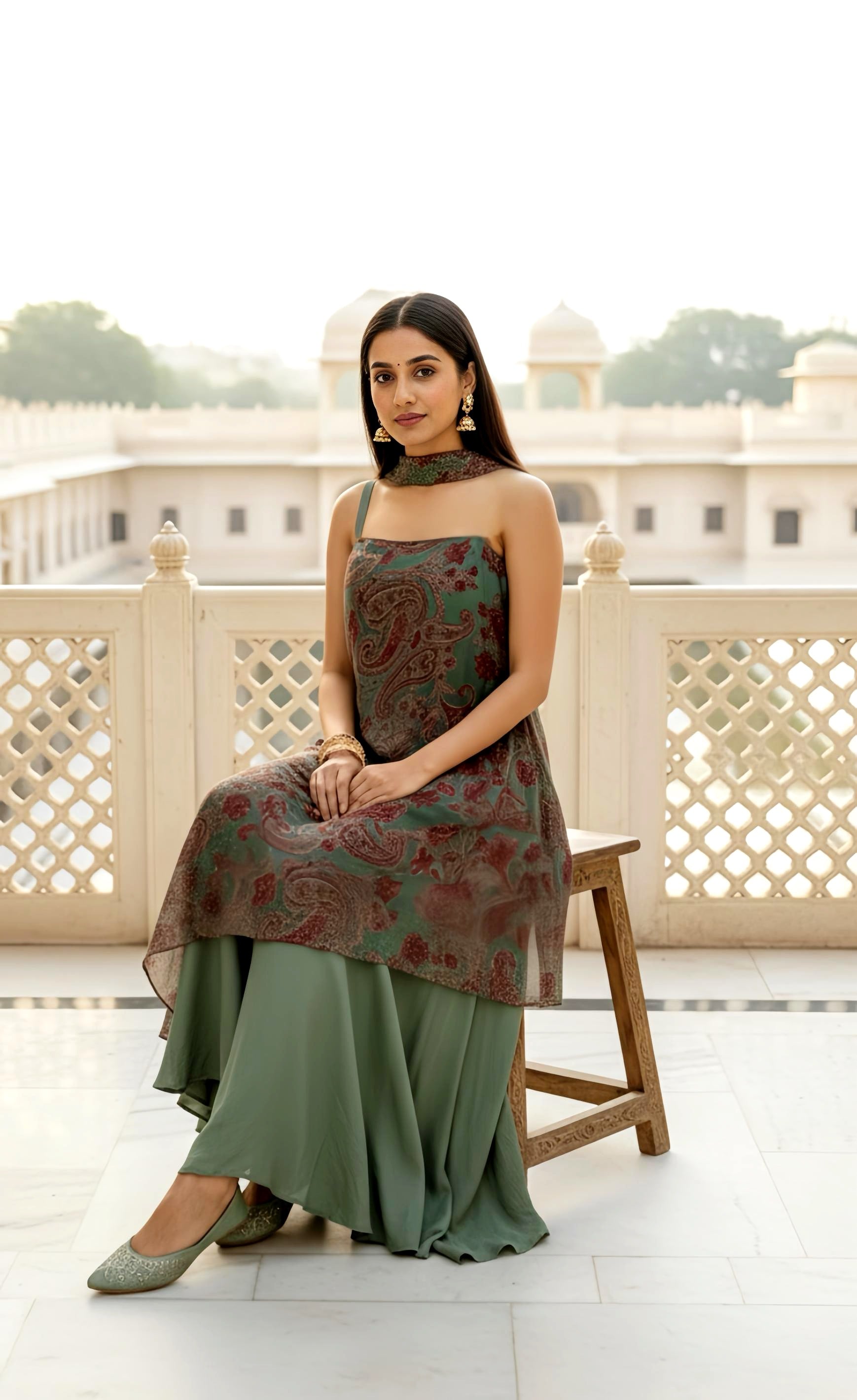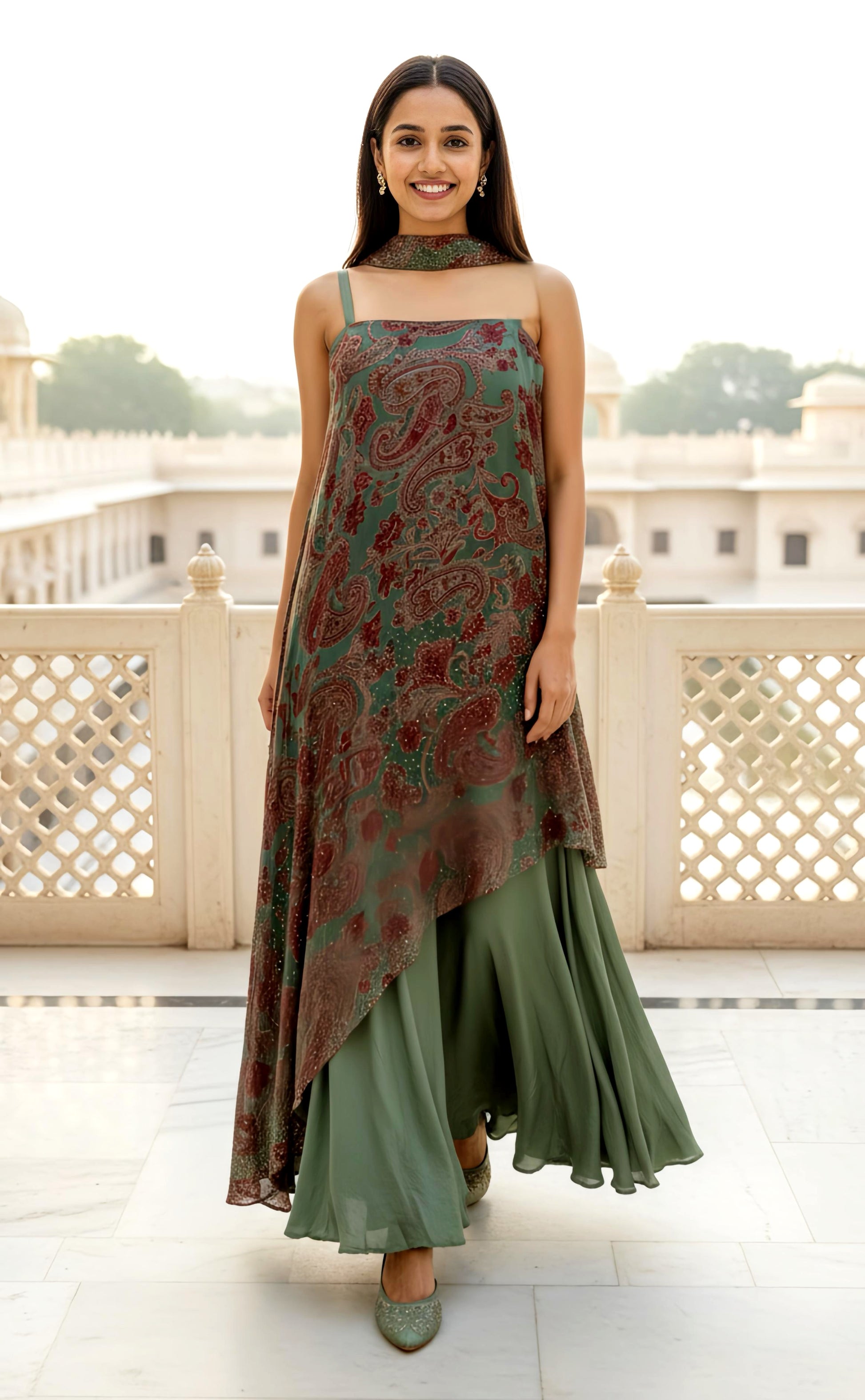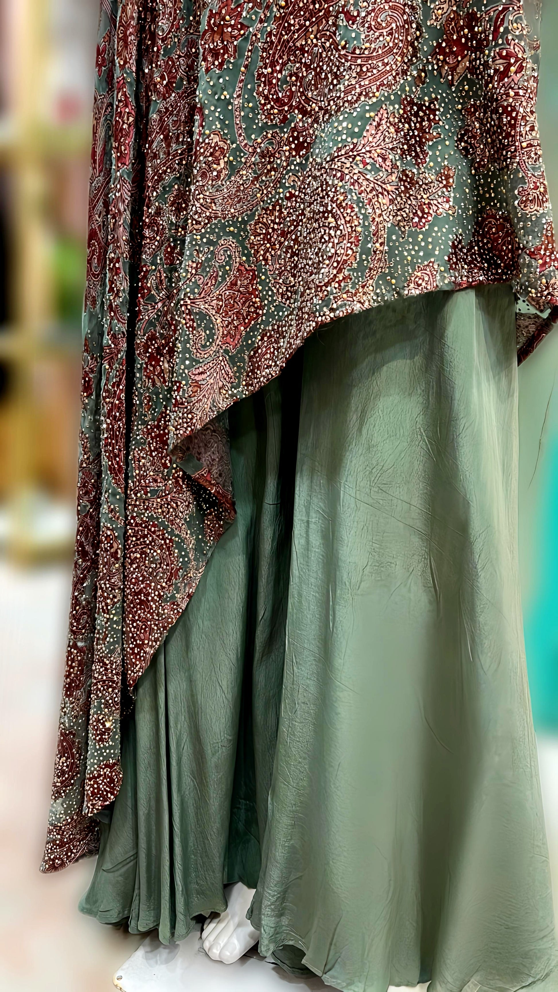 Elevate your style with this stunning one-shoulder outfit featuring a waterfall fall, stylish umbrella palazzo, and chokar net dupatta. Adorned with exquisite Swarovski bling, this ensemble radiates elegance and glamour for any special occasion.