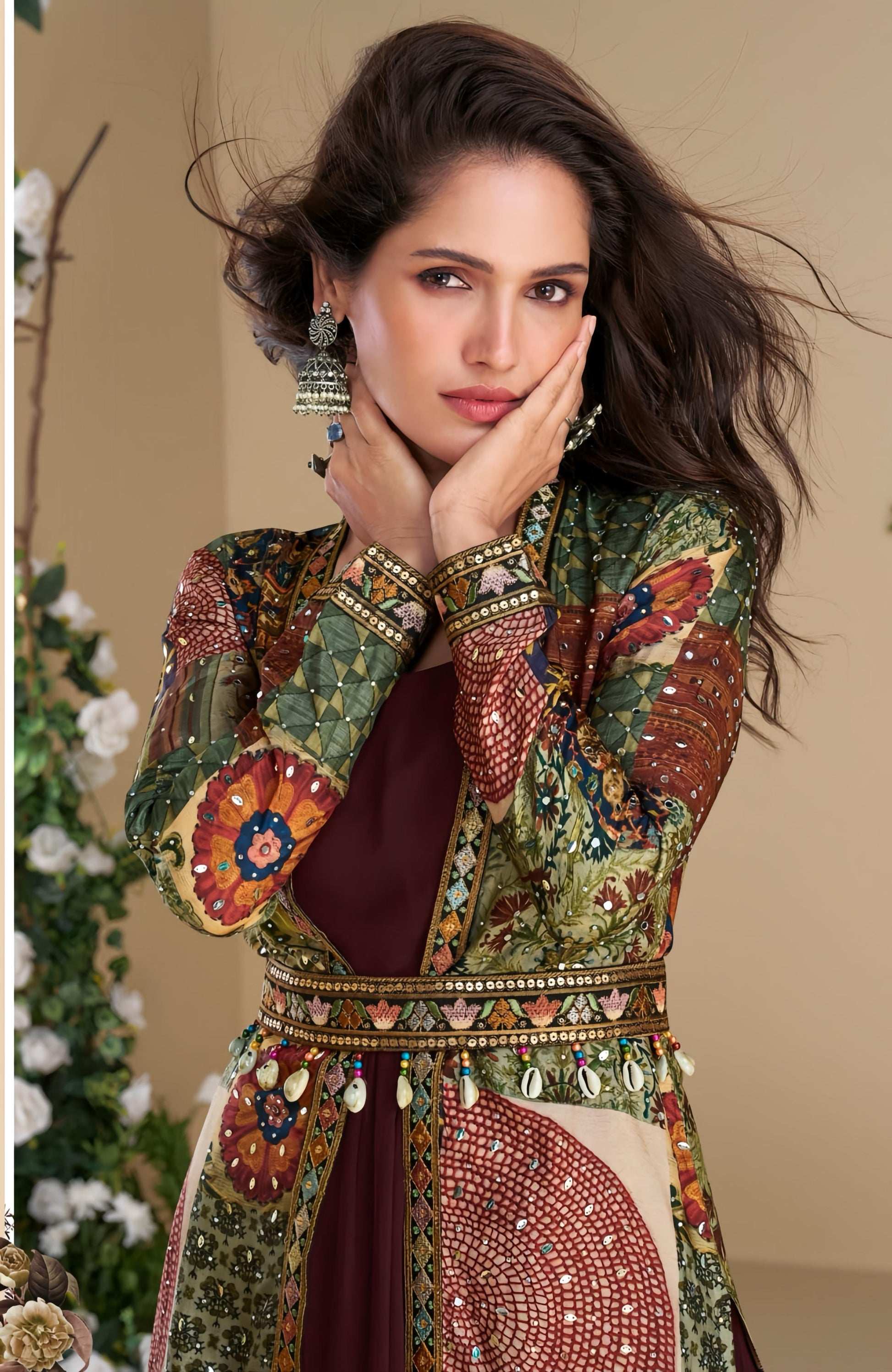 Elevate your ethnic fusion game with this stunning Indo-Western sleeveless gown crafted in flowy georgette, paired with a premium muslin silk jacket inspired by the vibrant artistry of Rann of Kutch. The look is cinched with a statement heavy belt adorned with playful tassels, blending tradition and trend in one graceful silhouette.