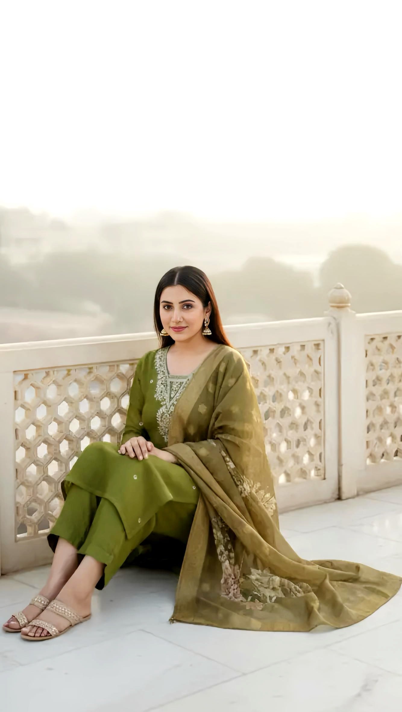 Indulge in luxury with this exquisite shimmer tissue outfit in a beautiful mehandi color. The soft, lustrous fabric drapes elegantly, while the full Maharani placement dupatta adds a regal touch to your ensemble. The highlight of this stunning piece is the heavy hand-embroidered neckline, showcasing intricate craftsmanship that exudes sophistication and grandeur. Perfect for weddings, festive celebrations, and special occasions where you want to make an unforgettable impression.