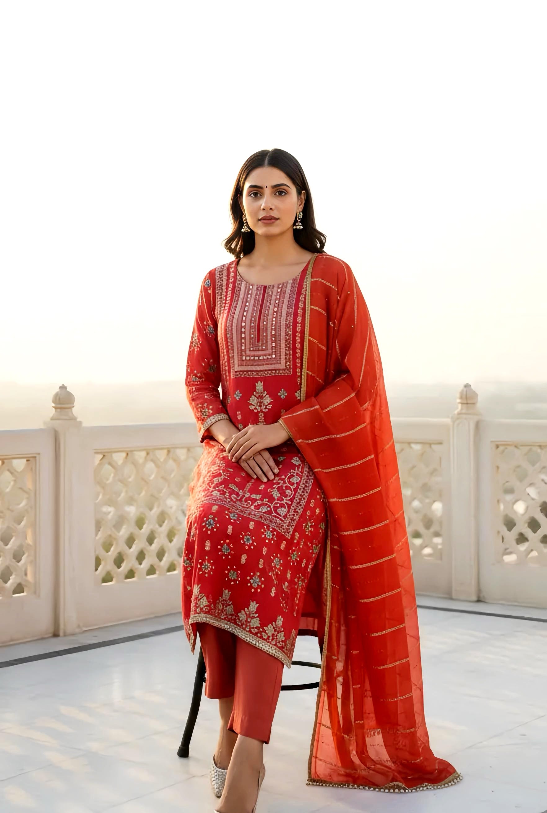 Make a bold statement in this stunning full suit crafted in luxurious brocade fabric, featuring a rich red rust color that exudes warmth, elegance, and timeless appeal. The shirt is beautifully enhanced with intricate hand embroidery that showcases exceptional craftsmanship, while the exquisite latkan lace finishing adds a traditional touch of sophistication. Perfect for weddings, festive celebrations, and special occasions, this ensemble combines opulent fabric with meticulous handwork for a look that's truly unforgettable.