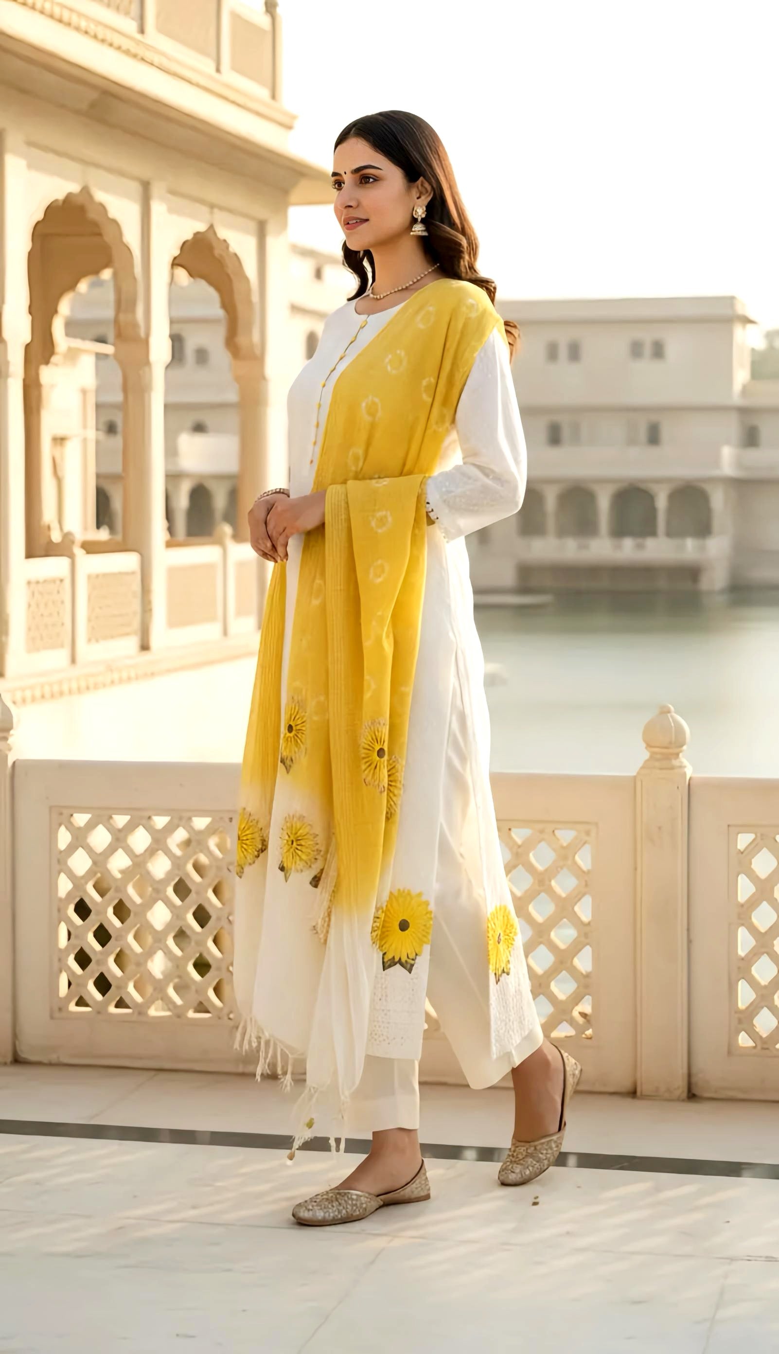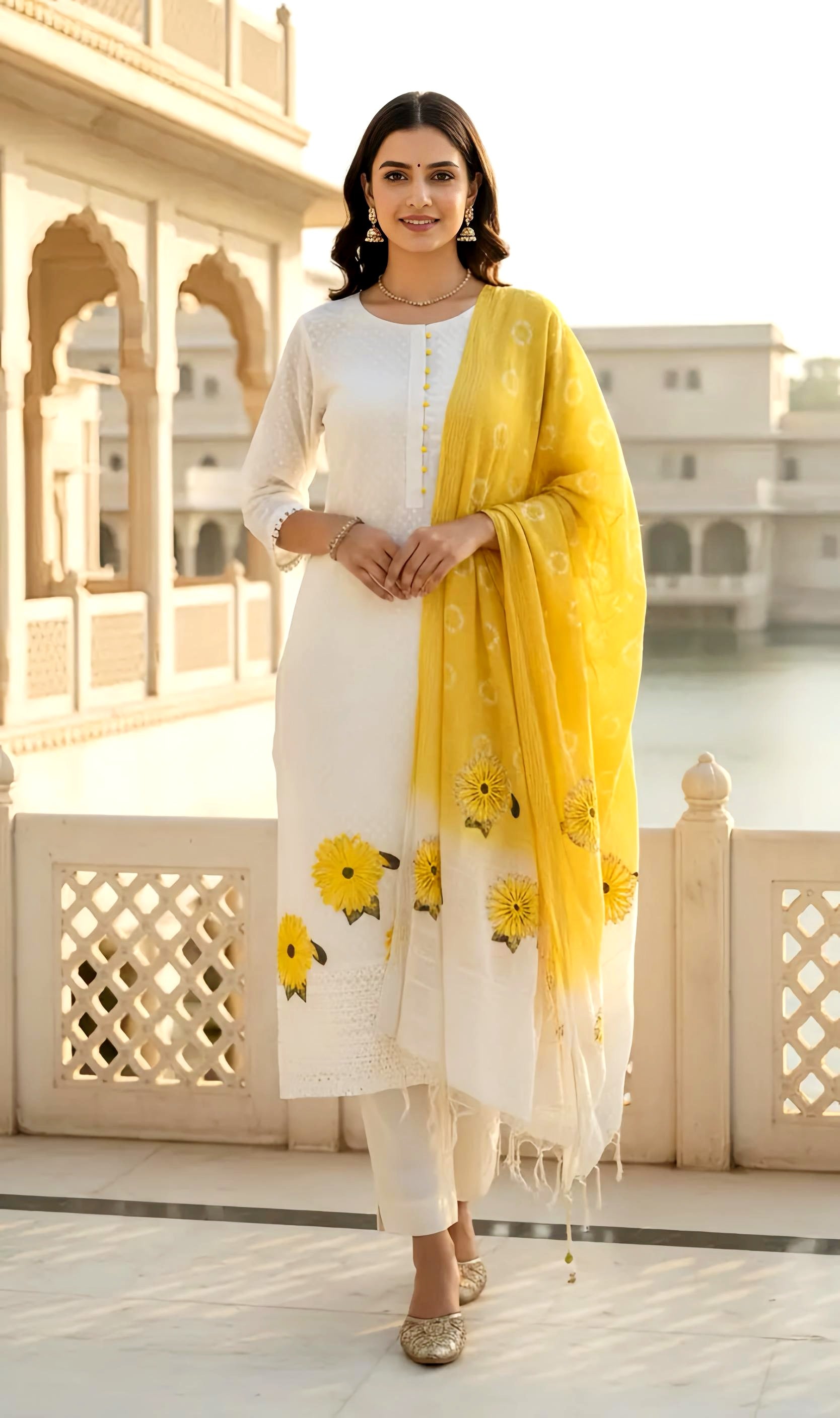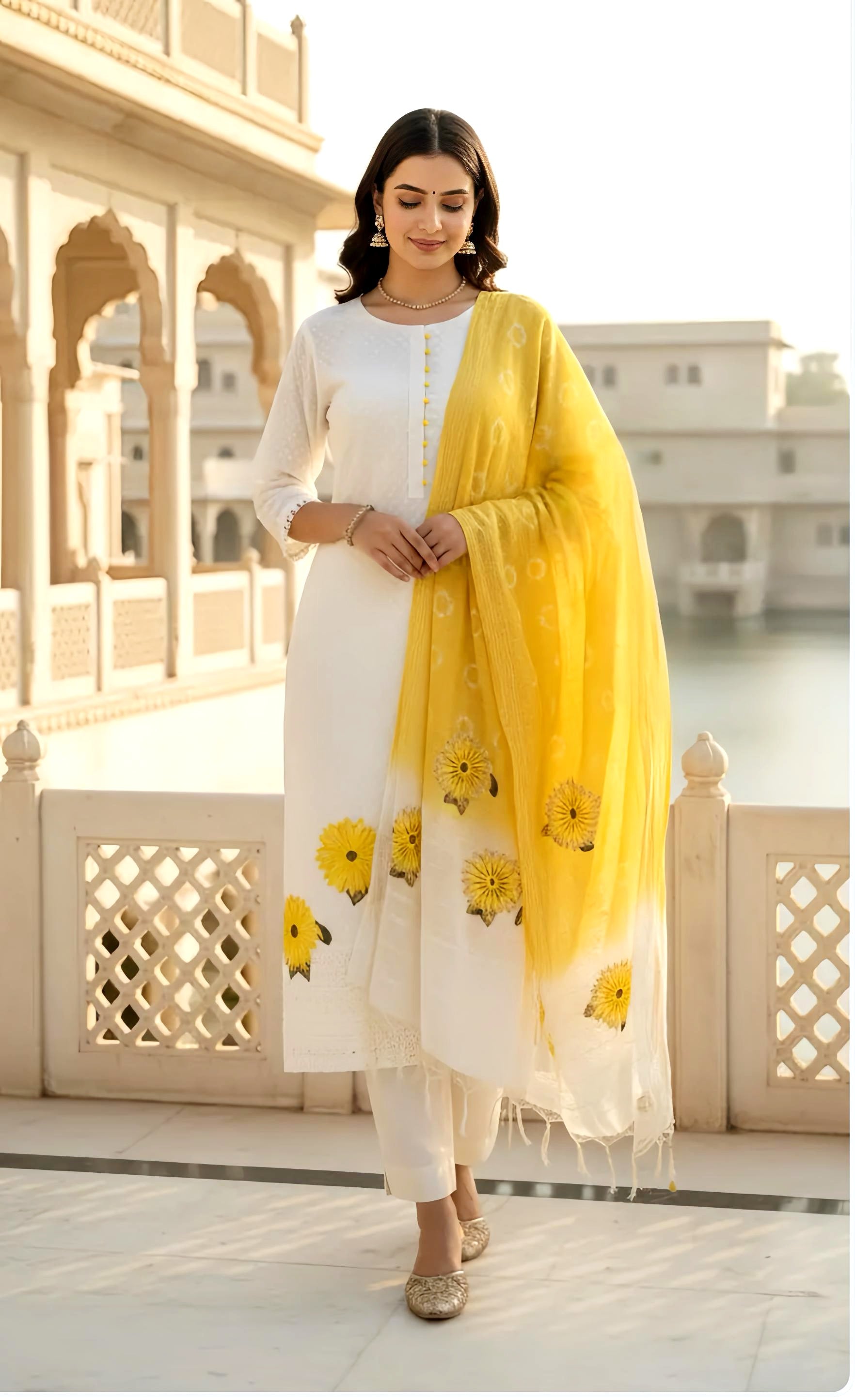 Experience luxury and sustainability with this premium organic cotton suit, crafted for the conscious fashionista who values both style and eco-friendly choices. The exquisite applique work adorning the dupatta and shirt showcases intricate craftsmanship, adding an artistic touch that makes every piece unique. Perfect for festive occasions or special gatherings, this ensemble combines traditional artistry with modern comfort for an effortlessly elegant look.