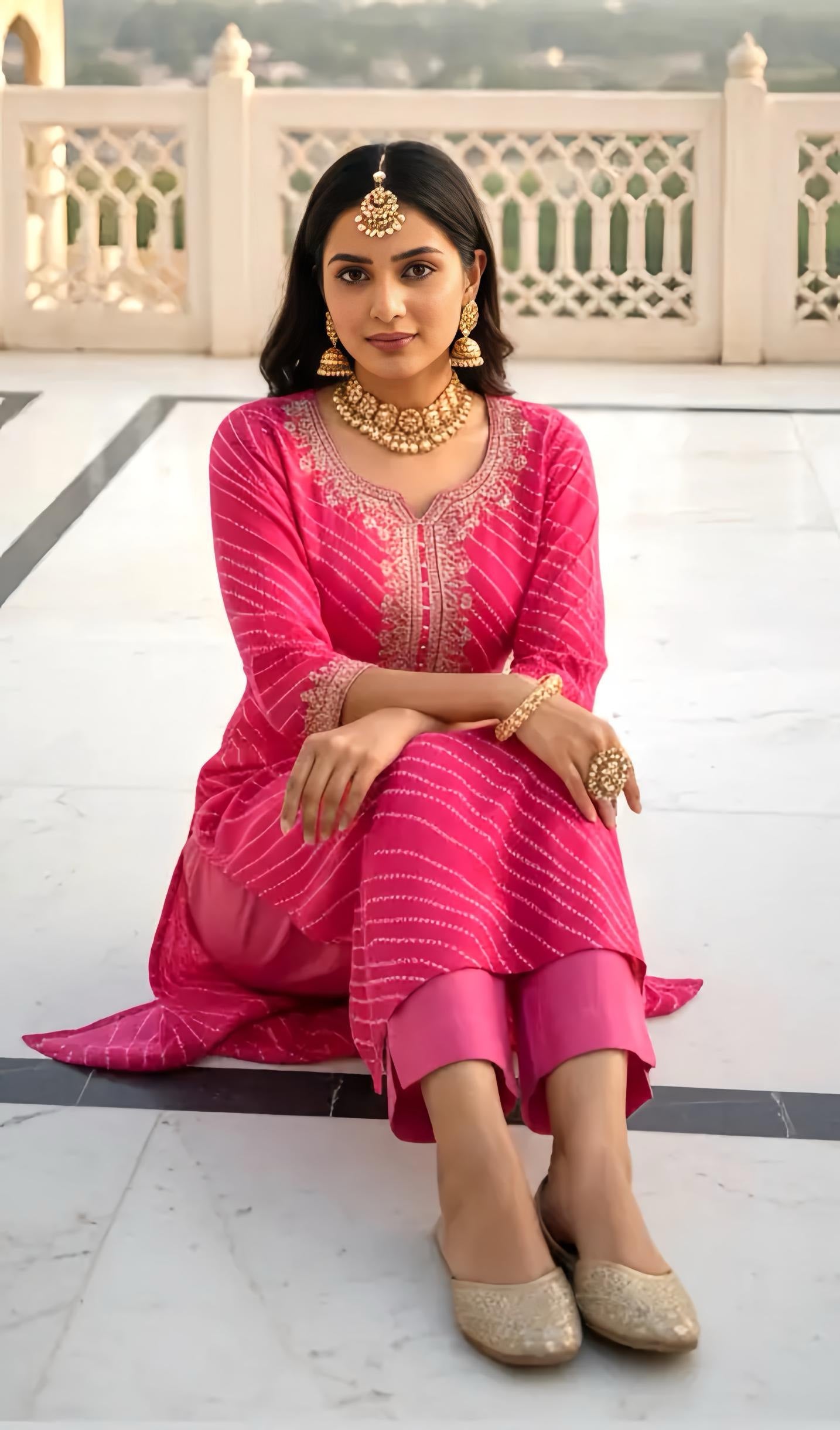 Elegant muslin kurta pants set featuring traditional bandni print that adds timeless charm to your ethnic wardrobe. The kurta is beautifully adorned with intricate zari work at the neck, adding a touch of sophistication and elegance. Paired with smart straight pants for a sleek, modern silhouette that's perfect for any occasion.